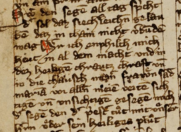 (fol. 32v) Swer den segen all tag spricht, der sol daz siecherleichen gelauben, daz in chain [waffen] nicht verbunden mag: „Herr, ich enphilch mich heut in al dein macht vnd in dez heiligen chraeucz chraft vnd in die chausch meiner frawen sand Marian. Vor allen meinen veiten [lies: veinden] sichtigen und vnsichtigen gesegne mich der segen, den der prester tůt mit vnserem herrn vber sein heiliges plůt, daz vnserm herrn auz seinen heiligen fünf wunden wFt. Daz sei vns hiut vnd ze allen zeiten vor allen wuntwaffen gůt vnd vor allen vnseren veinden vnser sel vnd vnser lesten zeit, vor den posen gaisten mFzen wir hiut vnd ze allen zeiten alz wol gesegnet sein alz der chelch vnd alz der wein vnd alz daz lembtig prot, daz vnser herre seinen heiligen jungern poͤt, vor allem vngelüche, daz vns schedleich sei an leib oder an sel.“ Dar zů sprich v pater noster und v ave maria.